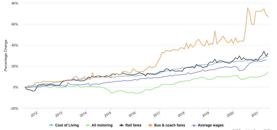 Trying to book a train from where I live to Glasgow* in September reminded me of this graph from the RAC Foundation. In the UK, the costs of motoring have risen at a lower rate than average wages and the cost of living since 2013. Just look at the rises in costs of buses and trains in comparison. How is this sustainable in a low carbon future?